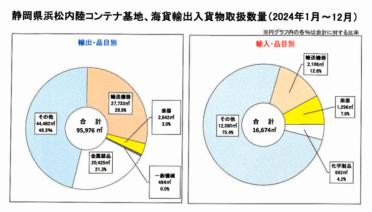 浜松内陸コンテナ基地は、東名高速道路、国道1号線、国道150号線などにより、清水港、御前崎港、名古屋港など県内外の港湾と結ばれているため、海上輸送コンテナを使って様々な貨物を安全かつ迅速に輸出入することが可能な「内陸の国際貿易港」です。